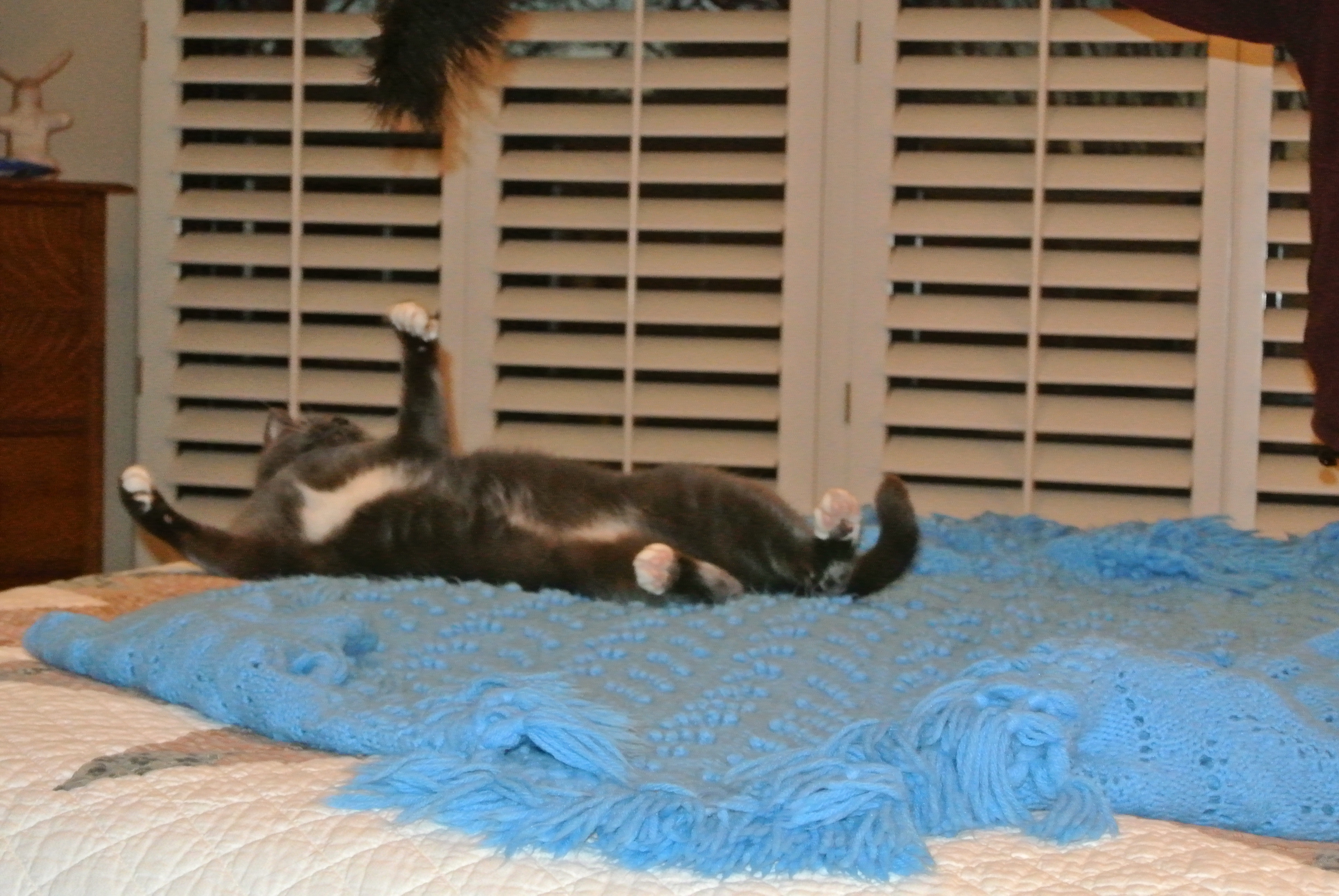 TA DA! Slept right next to DAD all night long! Yep, I flooped right down on his legs and never left…even had my head facing toward him instead of my ususal butt facing the top of the bed like I usually do even with Mom…all you cats know…facing the top of the bed takes courage…ya really gotta feel safe to put your head closest…always safer to have the butt facing up in case ya need to slam out of bed for danger or just to do the perimeter check of the house….