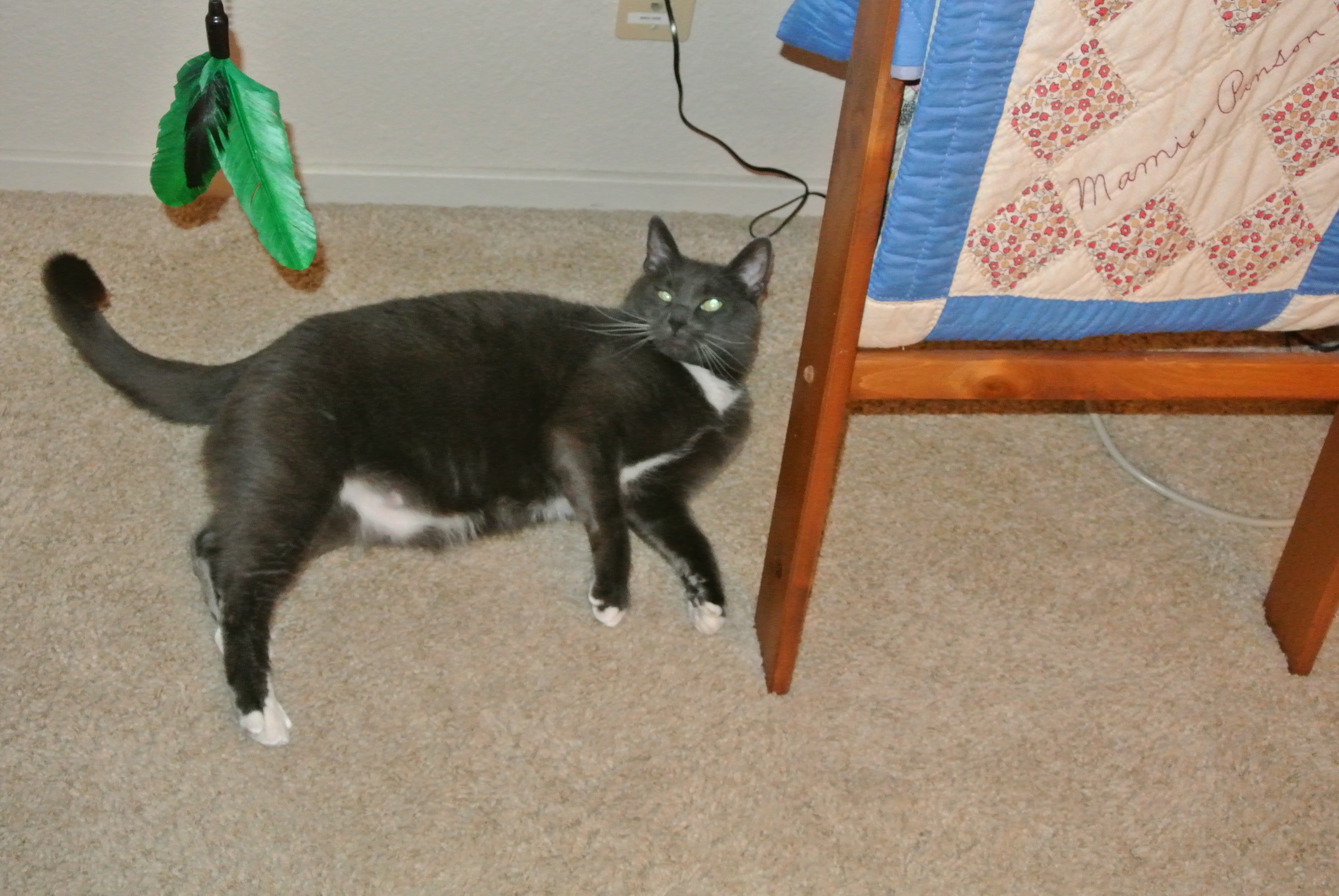 Then I catch my breath thinking Mom will be tired by now…but nooooooooo…she says there is still the upper body workout to do…ya know…building your chest, back, front legs…gettin’ good eye–prey—paw coordination…so out comes the green feather thingy (which I luvluvluv) but Oh Cat!…I’m getting a bit tired here…