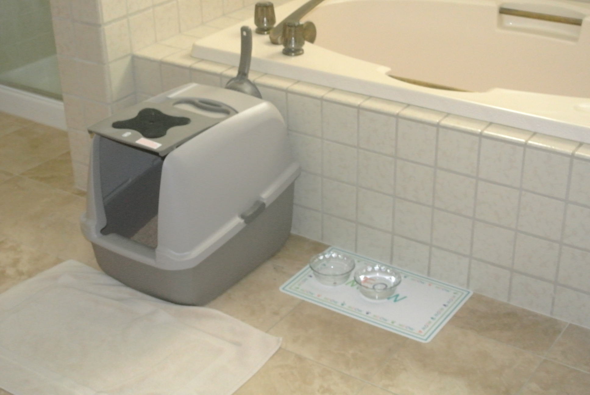 …now for current times…Mom and Dad have already prepared my prison  hotel suite for when I must be secluded while the movers take our furniture on Monday…(this is in keeping with Saturday Photo hunt “ESCAPE”)…this is my Kitty Potty Pod and feeding station…