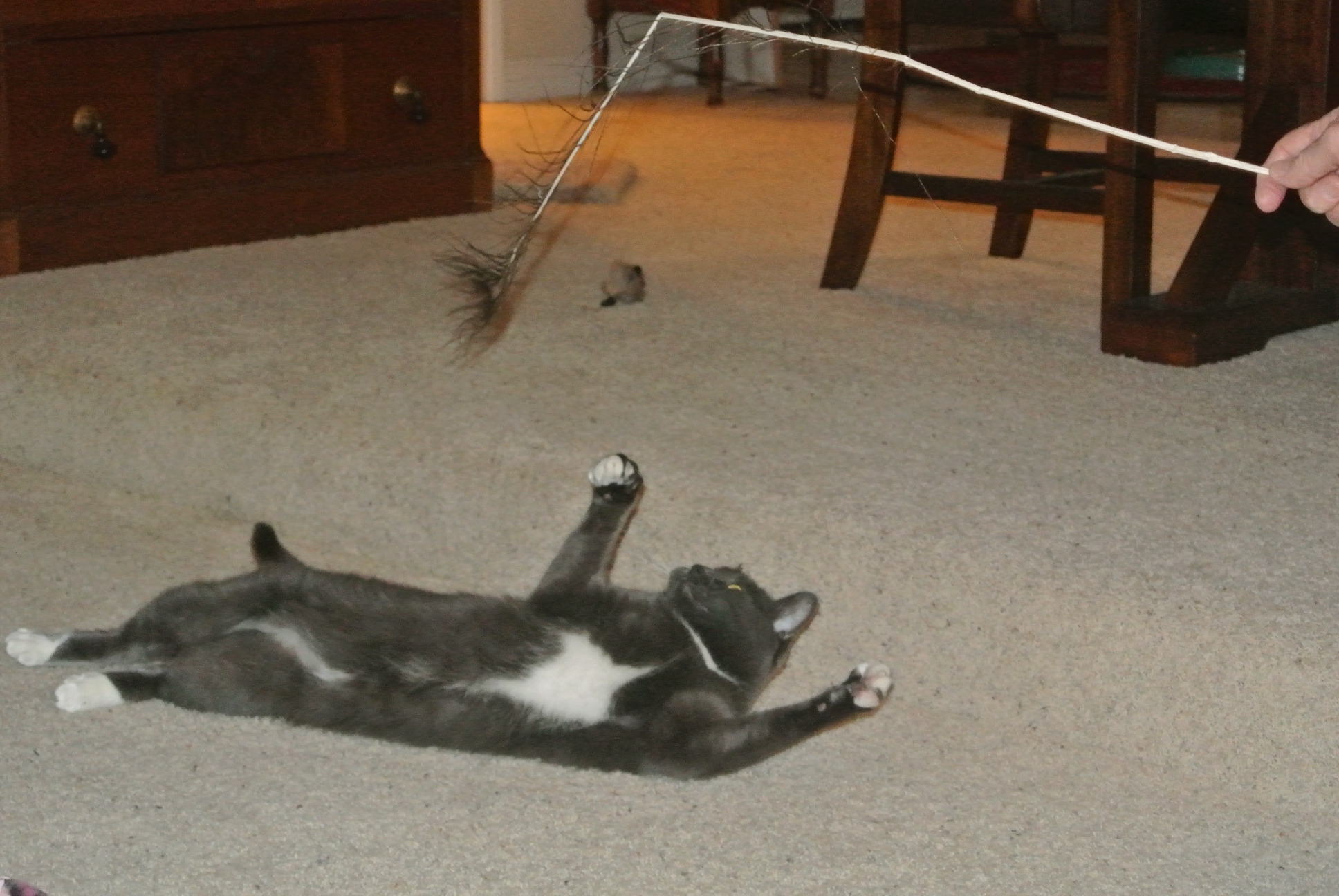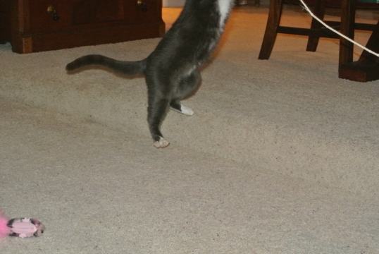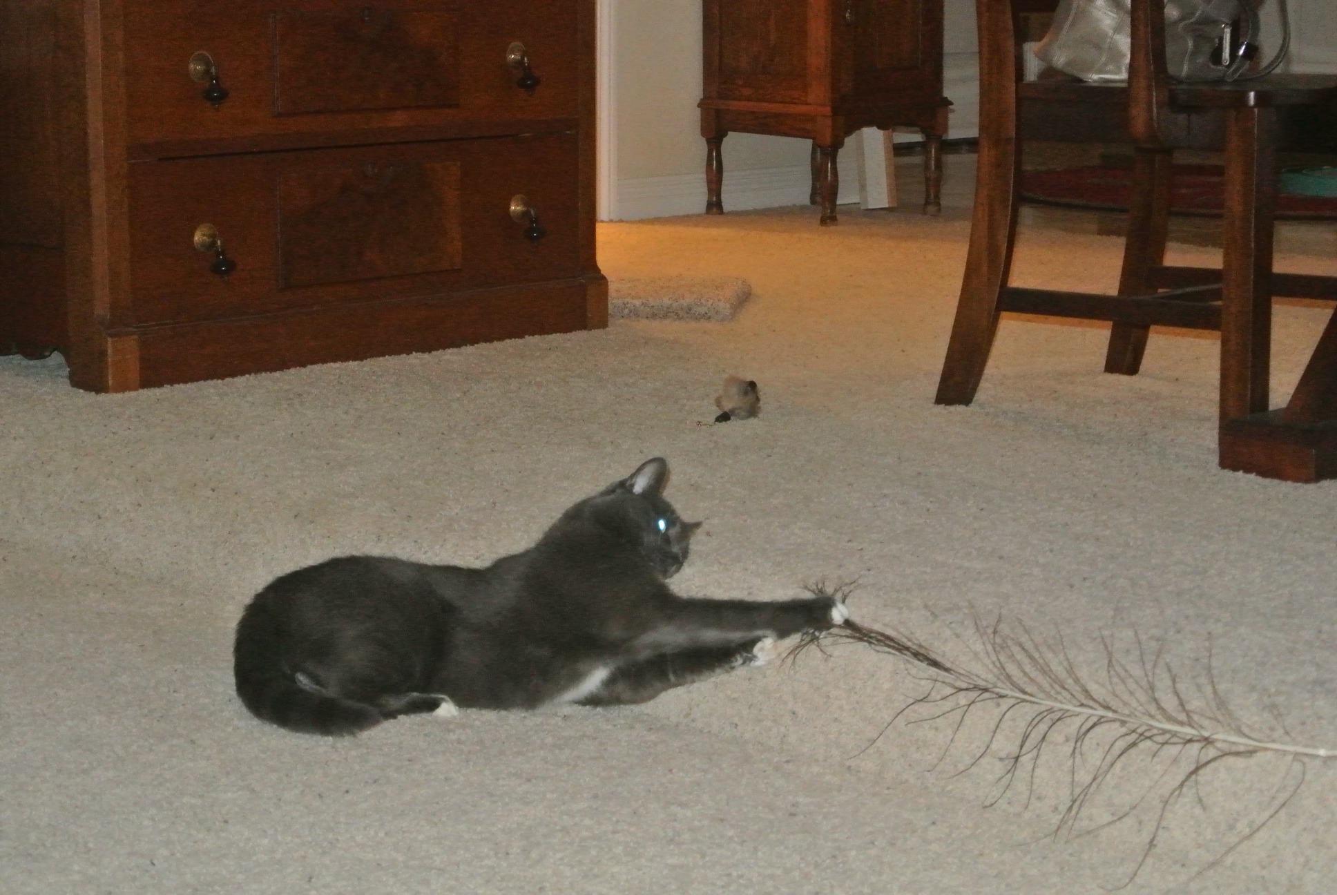 Me haz a brown cour-du-roy mouse wif a lonf feather tail n it iz my faborite toy now…dere iz sumfing about fetherz!!!!