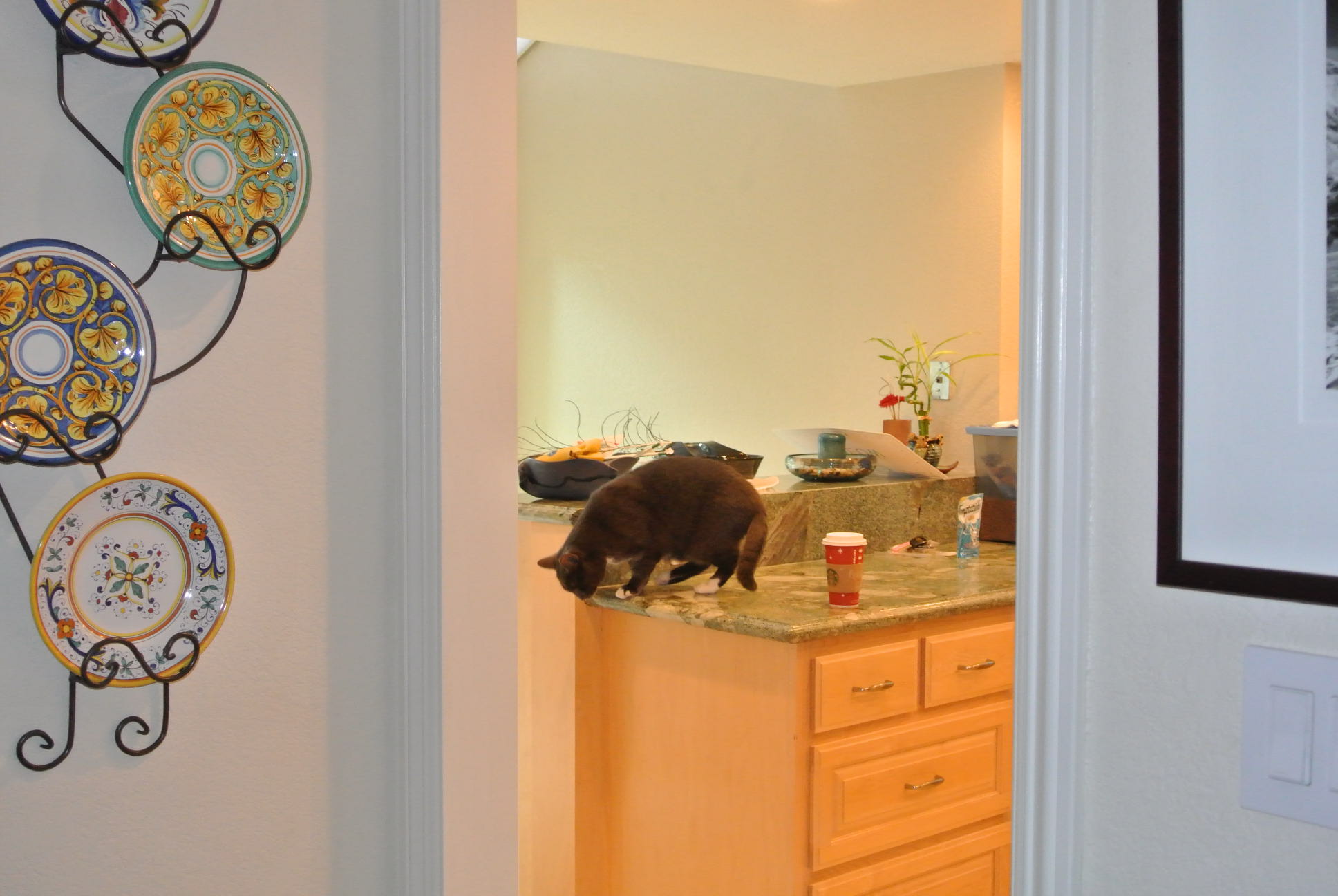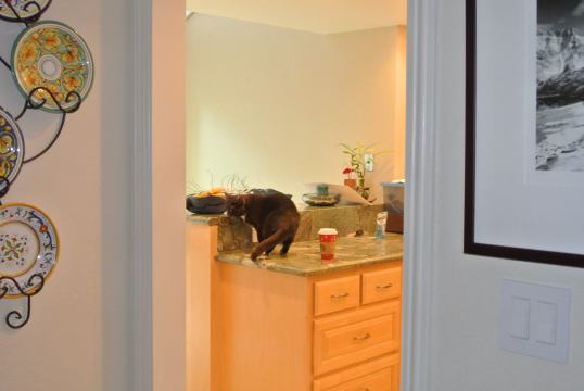 Then, when Auntie Shannon was here on Thursday, HOOVER DAY, she was chatting with Mom like girls do…and Auntie Shannon had left her Starbucks coffee on the kitchen counter…I could smell it.   So while they chatted…I explored…much to both their surprise!