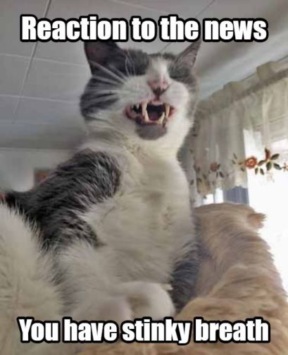 Now don’t go think’in that Hitch DOES have stinky breath. But, you all know what it feels like to have your humans go into their “stinky face” expressions whenever you accidentally let out a little ole burp, right? So what’s the big deal. A little fresh chicken or fishie smell to enhance the living room.