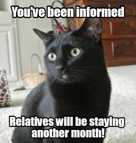 My human doesn’t have any relatives, but I do enjoy it when friends come over. Except if they stay overnight and take up too much of my human’s time. Then it’s annoying.