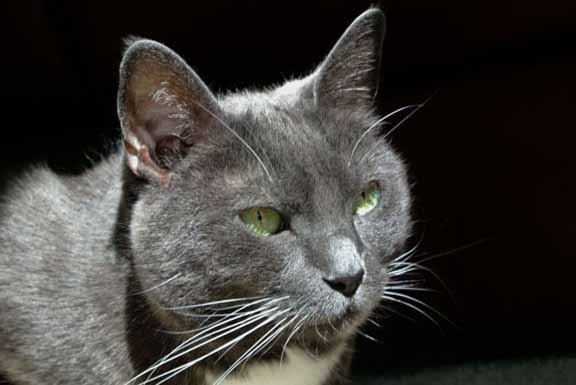 But, there at Kitty Corner, she languished, seldom touched, hiding from the volunteers and potential adopters for over a year. The Peter and I started to clean once a week at Kitty Corner and Peter found her hiding in a small cubby against a wall. Such a gorgeous kitty; Russian Blue gray and white toes in front and full white socks on her back paws—a white bikini on her tummy and stunning white chevron under her chin. And those glorious green, turquoise, gold eyes! Such long white whiskers.