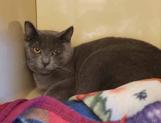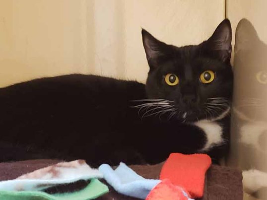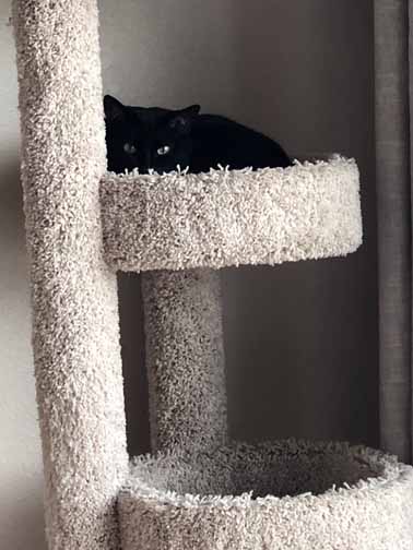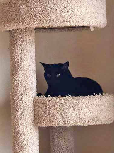 Another gray kitty, with striking amber eyes and a tuxedo. They are still shy but coming around.