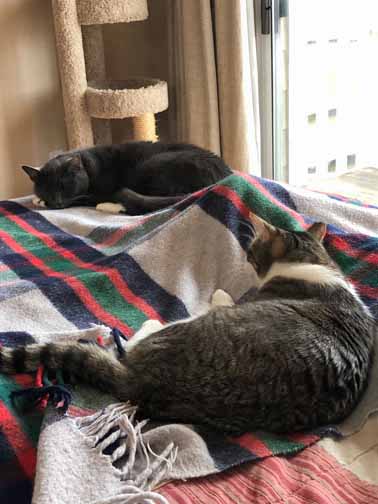 The white with black started to chill’ax faster, but the gray kitty turned out to be a lap cat!