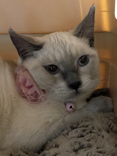 This photo was taken the morning Mom L and Dad P transported Katie and Lilly to Contra Costa Humane Society’s Kitty Corner free roaming shelter. My long time readers know this is my former shelter where Dad P found me and brought me to Mom L’s attention. The staff at Kitty Corner were open to accepting dear Katie, and Lilly and on other youngster, found dying in a friend’s back yard—Duchess. Duchess is a Lilac Point Siamese.