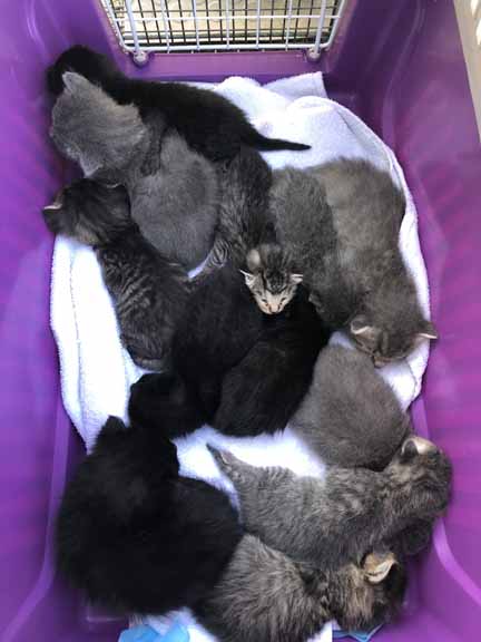 - Mind you, Mom L has only ever seen ONE mom cat hanging around all morning watching the action near her babies. She is a small all black kitty. But TWELVE kittens from one mom cat??? Mom cats only have eight “dinner plates” to serve their kittens. Maybe that’s why several of the kittens are clearly smaller?? Because they didn’t get to have as much time at the dinner table???