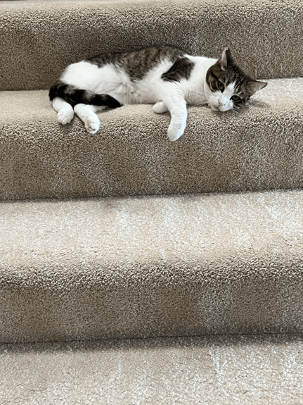 So you can see I am being well taken care of. I get so stressed going to the vet that Mom L now rides in the back seat with me and she opens the front door of my carrier so’s she can give me chin scritches to keep me from stressing. I always try to peek out and catch a glimpse of the passing scenery.