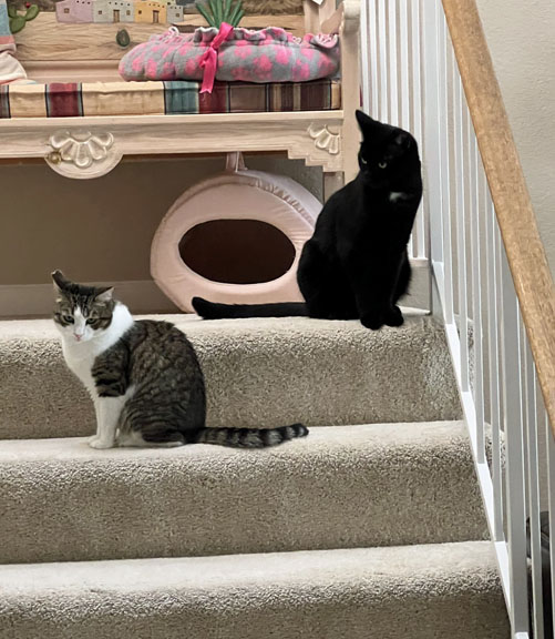 My doc is a good man. I trust him and he is very kind with me. He is helping Mom L and Dad P keep me comfortable in my senior years. I have chronic kidney disease (CKD) and Mom L and Dad P give me fluids every other day. That helps lots! I also have irritable bowel disease (IBD), and have had this for about eight years now. I get prednisolone gel in my ear every other day. Over the last four years, I have lost most of my ear furs but my gut track is doing OK. I have had a probiotic in my wet food for years now and even Sage is getting that along with me as she has developed IBD. We both get weekly vitamin B12 injections from Mom L too and I get a once a month Solensia injection from Mom L for my severe arty-right-us.